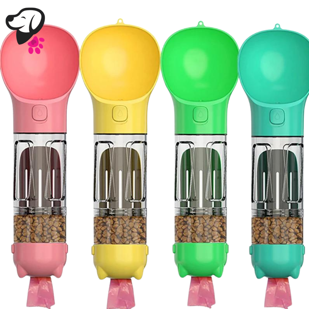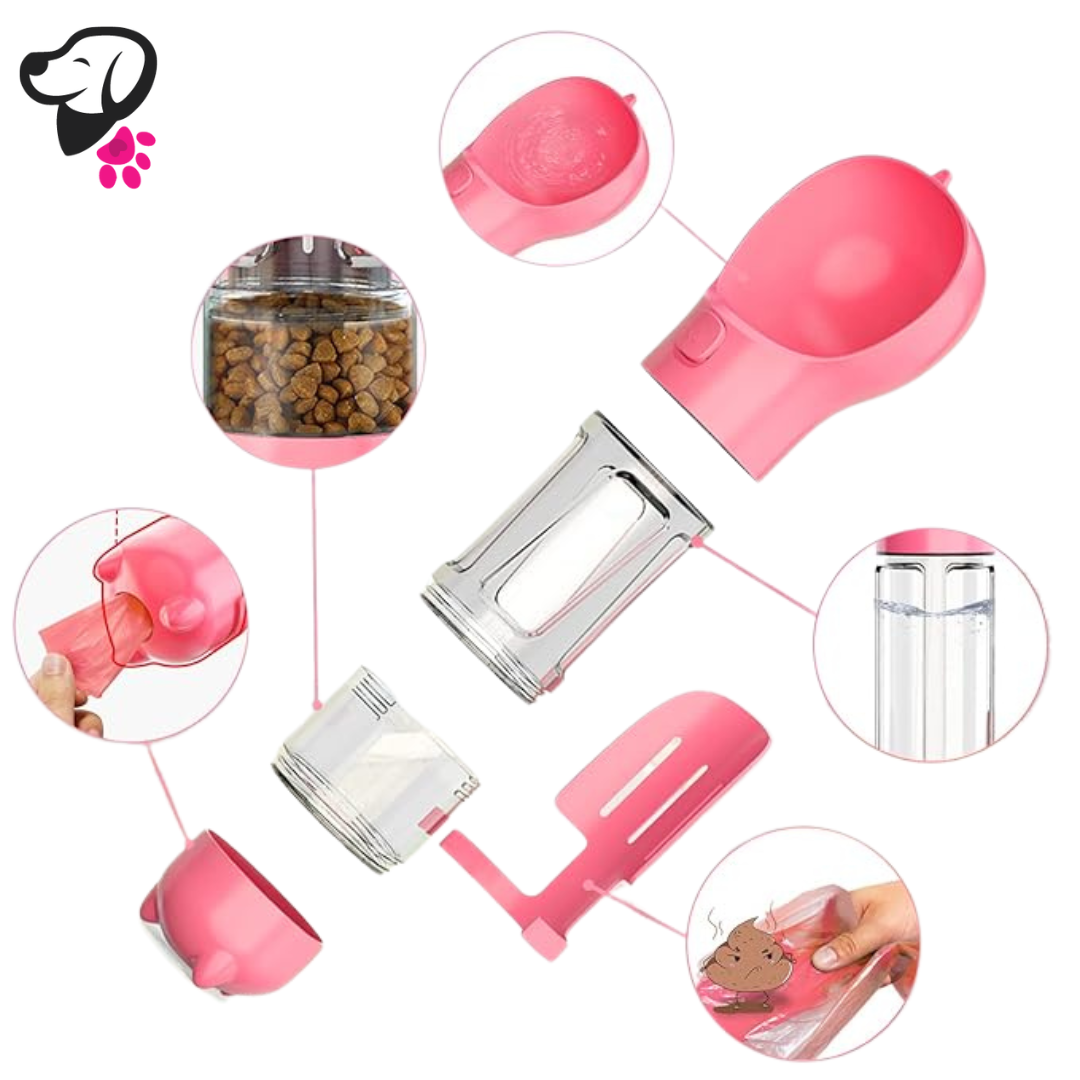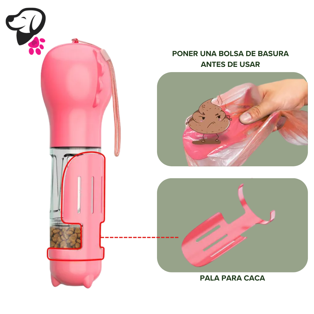 👉 Botella 4 en 1: Agua, comida, recogedor y bolsitas ¡todo en uno!